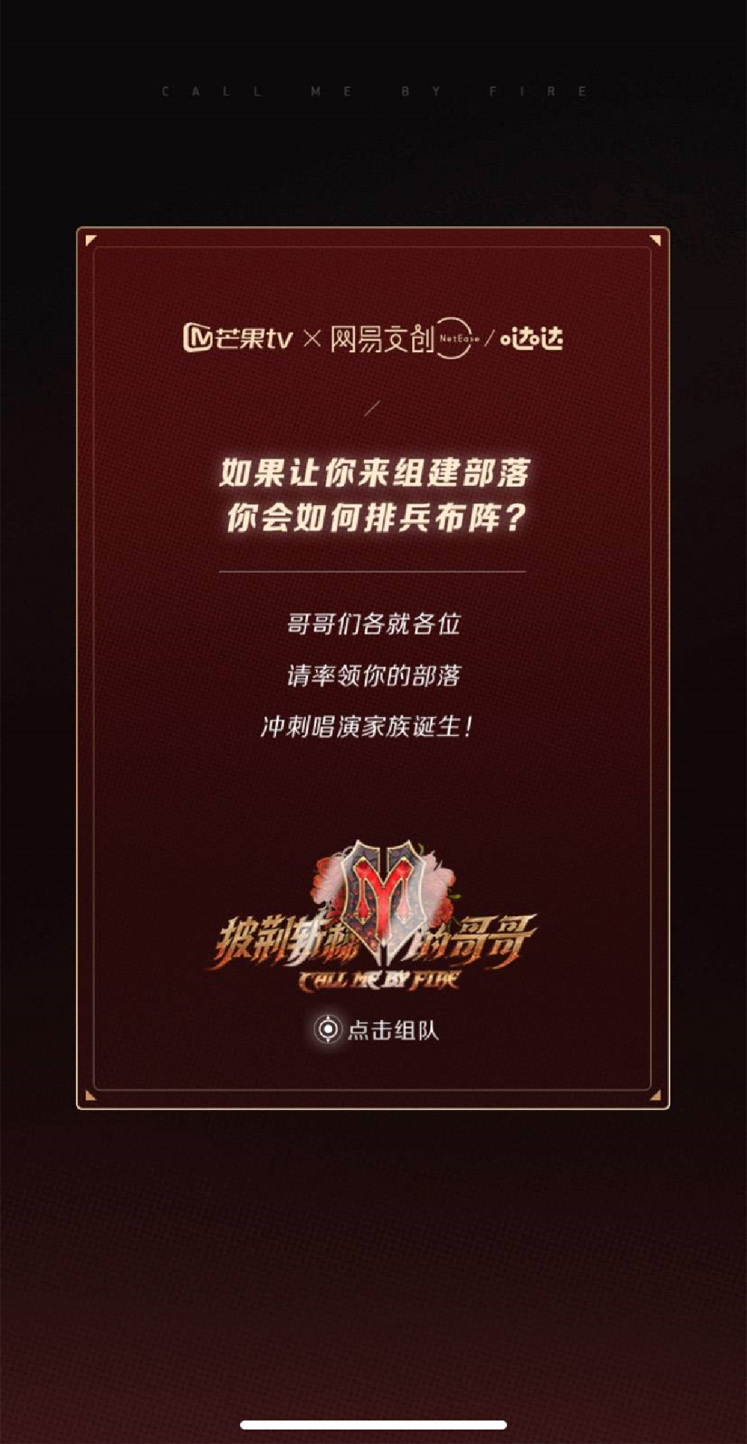 由芒果TV×网易文创推出的“组建部落冲刺唱演家族”,由用户选择自己心爱的哥哥组成不同人数的部落,生成海报,海报上标注着成团播放时间。